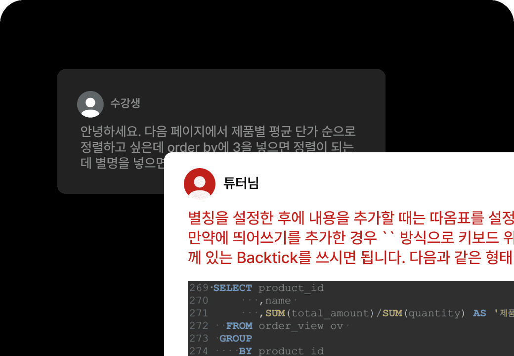 2년 연속 코딩교육 브랜드 1위, 스파르타클럽이 만든 내일배움캠프의 압도적인 수료율(92.8%)이 증명합니다. 과정이 시작되면, 강의만 제공하고 방치하는 부트캠프가 아닌, 프로젝트 시작부터 결과물까지 얻을 수 있도록 튜터와 운영진이 꼼꼼하게 밀착 케어하는 부트캠프로 운영합니다. 튜터 상주 : 궁금한 점은 기다리지 않고 바로 질문 및 피드백 가능 운영 매니저 : 프로젝트를 토대로 수강생의 수준을 객관적으로 진단하고 효율적인 학습 방향 제시, 1:1 진도율 관리